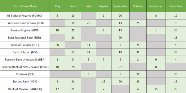 Each central bank has its own annual schedule when announcing its rates. In the trading world, it’s prudent to keep a tab on these announcements as it impacts market volatility if there is a sudden interest rate rise or fall.