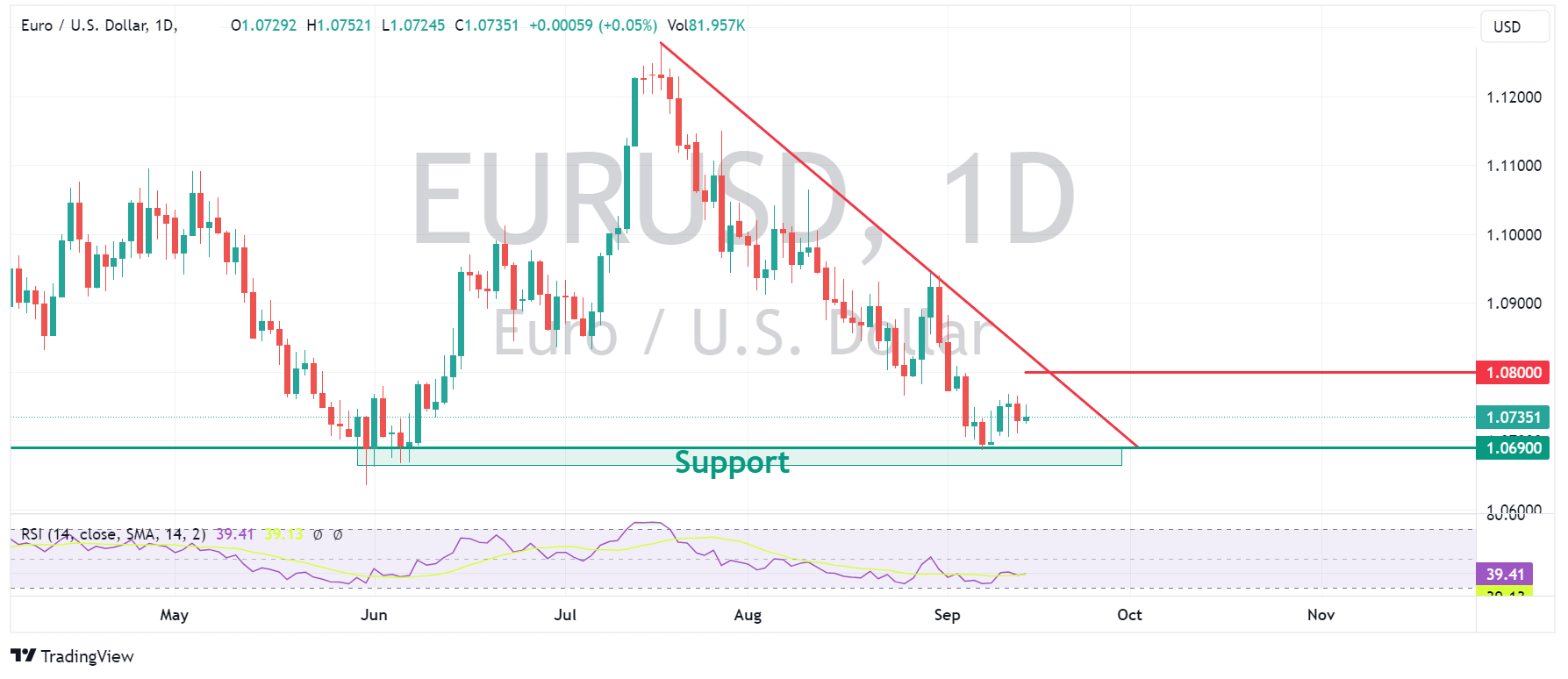No hike and a statement anything less than ultra hawkish will likely see a sharp drop in EURUSD initially, possibly testing the June and September lows support zone just under 1.07. This will be a key area to watch after the initial reaction.