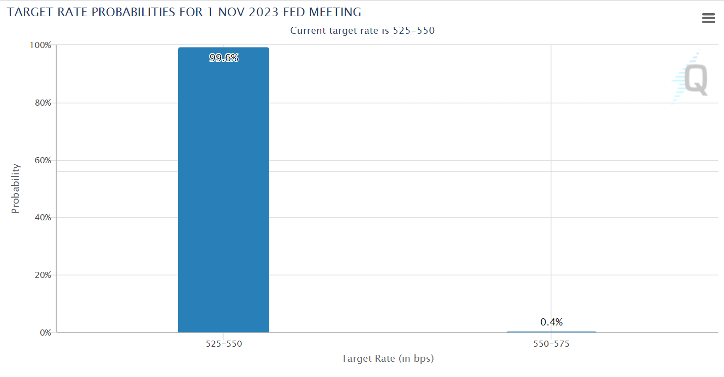 With inflation easing, and no major data released in the past month to indicate a reversal, markets have priced in a hold at November’s meeting. As this has been widely accepted, this