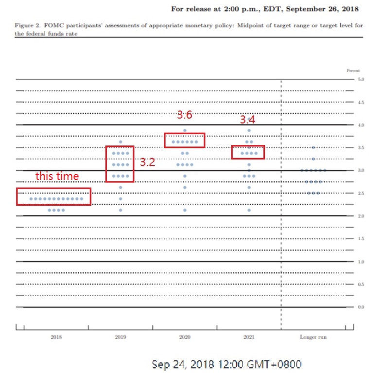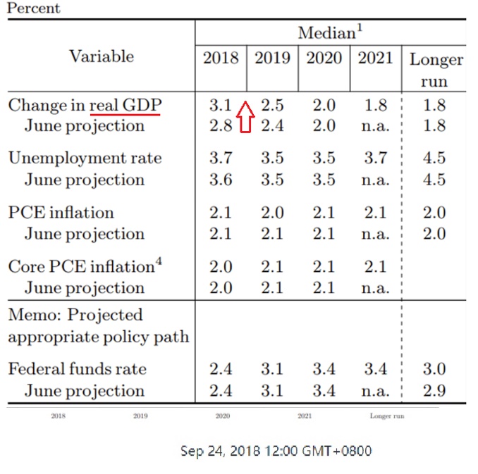 Most of the numbers remain unchanged compared with June 2018’s prediction, but notably, they adjusted the GDP forecast from 2.8% to 3.1%, which is more optimistic.We all know that the “balance sheet normalization plan” initiated by the Fed in October last year 2017. The purpose of this plan is to reduce the huge amount of debt back to its “normal” size (i.e., not too far away for the country’s GDP level)