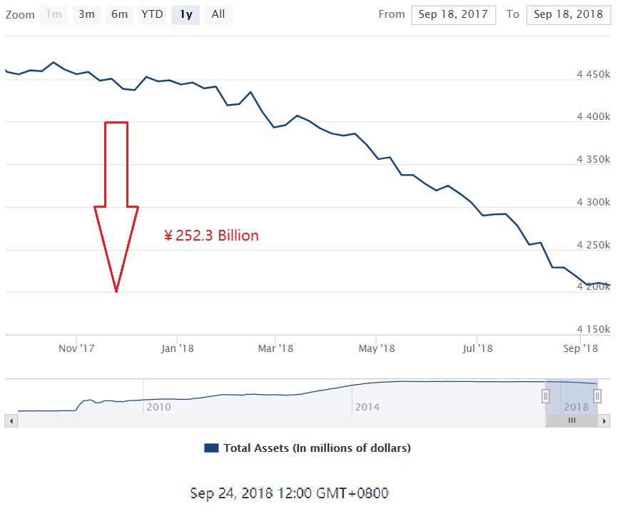 Let’s see how it goes up till today: after one year of the reduction process, the total assets (including liabilities) of the US has dropped from nearly $4.5 trillion to $4.2 trillion.