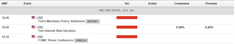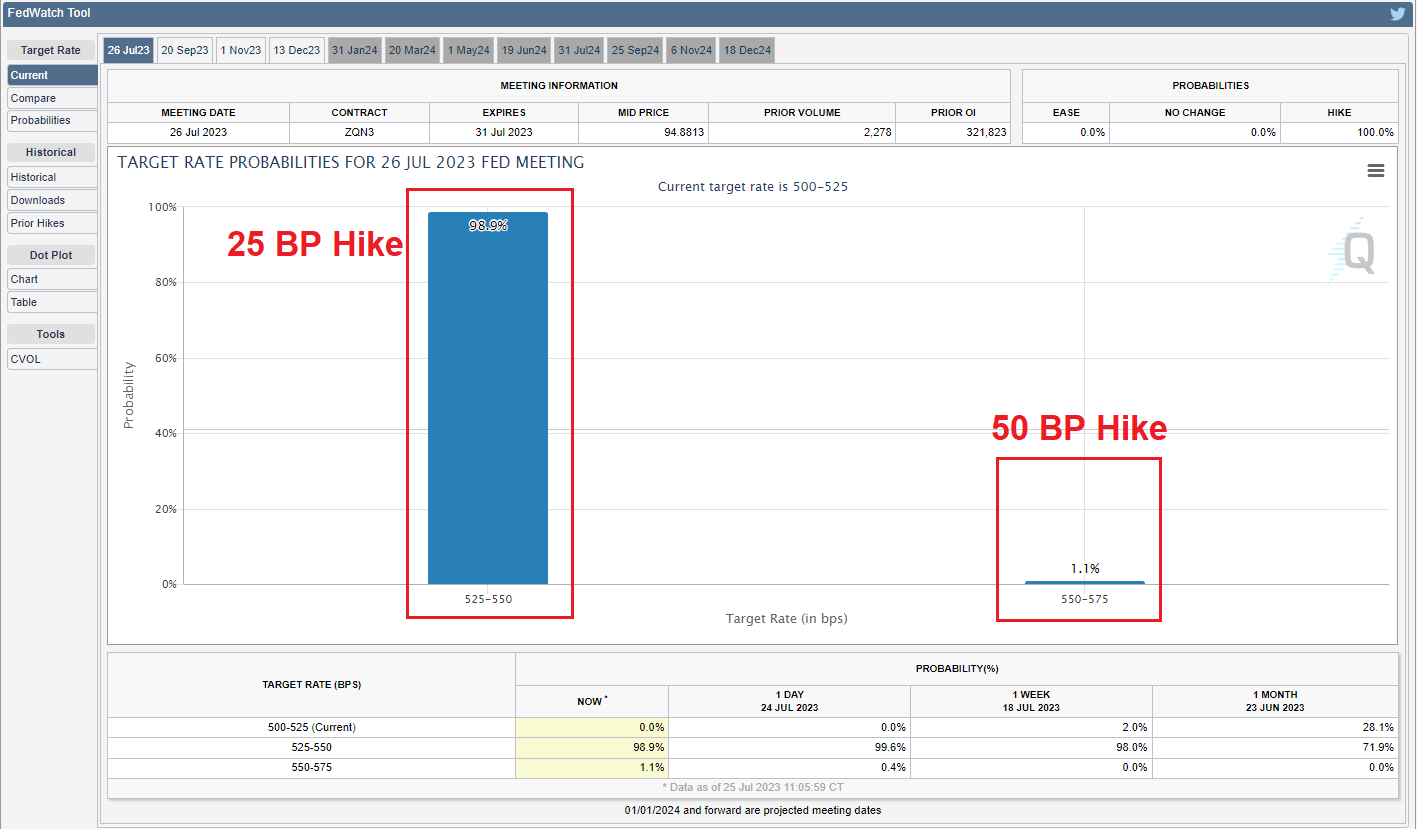26 July 2023 By Lachlan MeakinThe long-awaited July FOMC meeting is finally upon us where rates markets are pricing in a sure thing for a 25bp hike (even a small chance of a 50bp), the question that traders will be looking for to be answered is “is this it?”. With a growing number of economists calling this the top in rates, butting up against the FOMC June statement and unwavering Fed speak since, giving guidance that there will be two more this year (including July if it happens).
