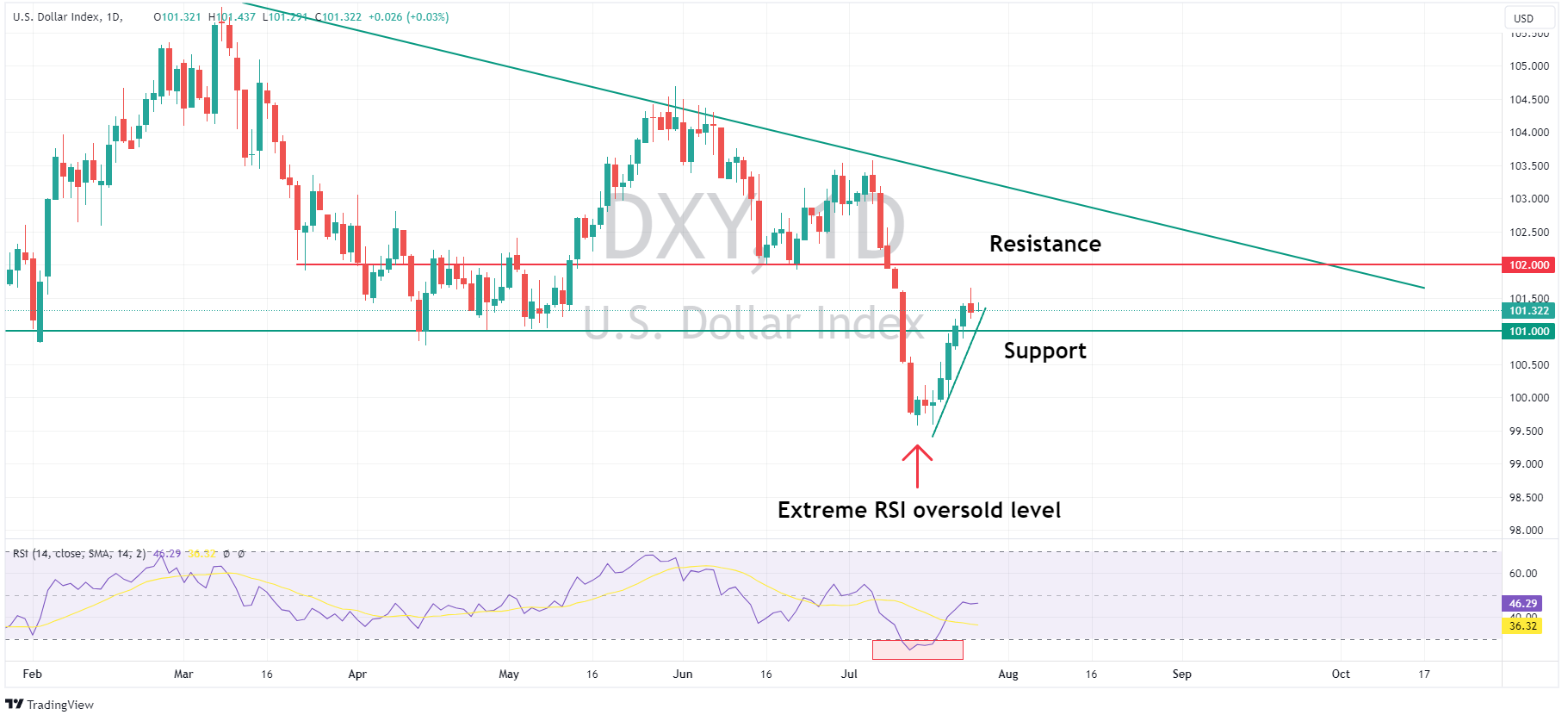 It’s been straight up since mid-July after DXY bounced from extreme oversold levels, breaking through and holding the key S/R (and psychological) 101 level, which has held as support in the last couple of sessions. Despite this recent rally DXY is still in the oversold half of it’s daily RSI, a hawkish Fed pushing back against the market today would likely see DXY push to test the next major S/R level at 102.