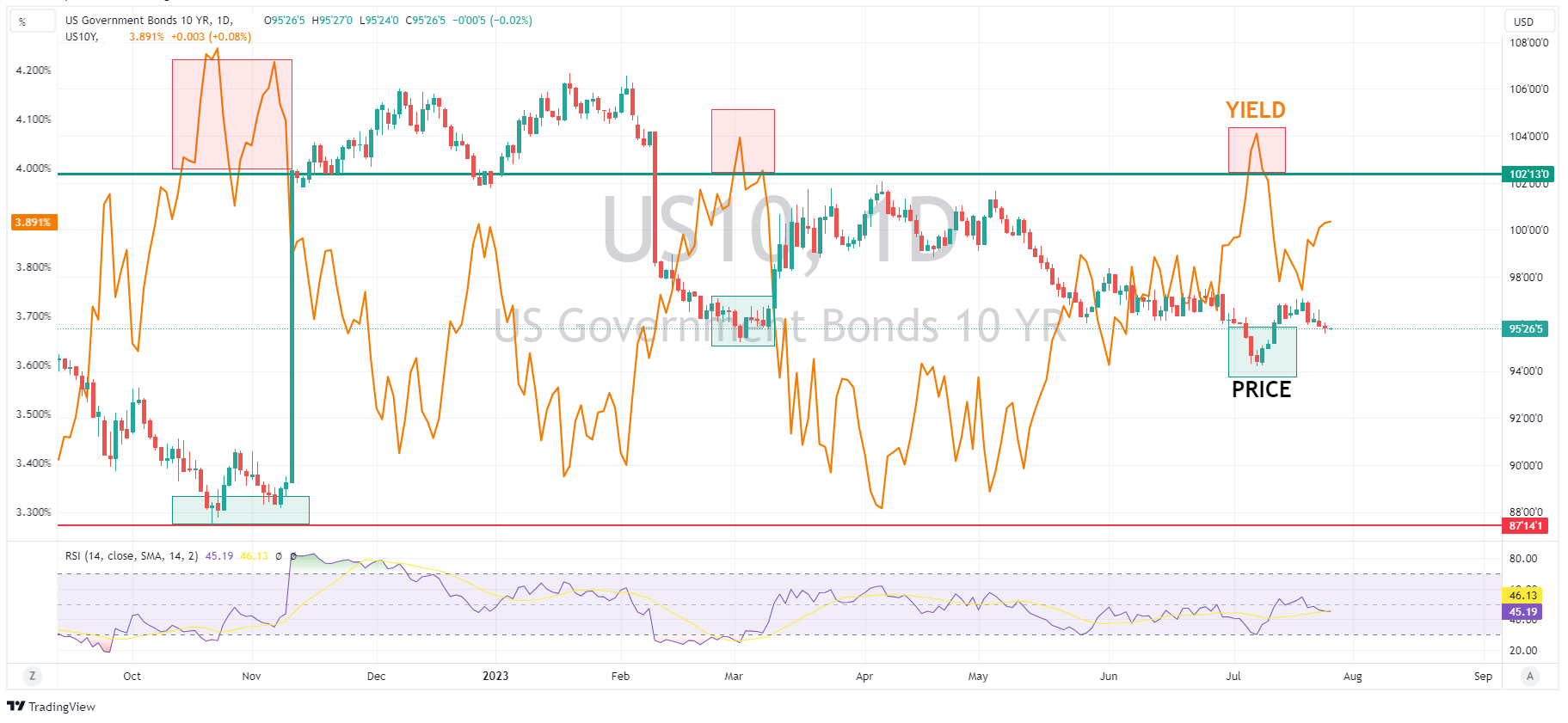 Looking at the chart of the US 10-year with the yields superimposed to see the negative correlation between the two (when you trade bonds, you trade the price, not yield) Over the last twelve months the yield on the 10-year has tested and subsequently struggled to stay above 4%, this turn lower in yields at this level gives a bond trader an opportunity by buying the bond price. Todays FOMC should see some volatility in yields, I recommend keeping an eye on these over the coming days for some good trading opportunities as yields hit pivotal levels.
