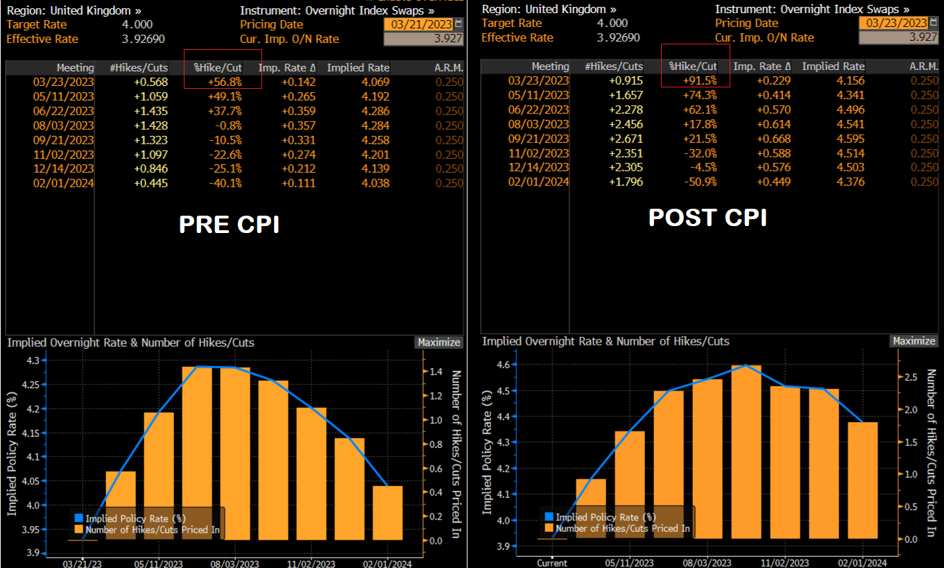 Unwelcome news for the BoE who have a rate meeting today, before this figure the decision seemed to be on a knife edge, with the markets pricing in a 50-50 chance of a 25bp hike or a hold, those odds have since blown out to make a hike pretty much a done deal with the market pricing in a 90% chance that the BoE will keep the tightening process going. The big change in hike expectations can be seen below, in the Pre CPI vs the Post CPI figures