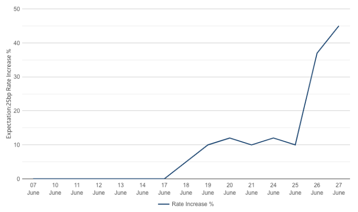 So how to position for the coming 5 weeks ahead of the August 6 meeting. Firstly understand that consensus amongst the economic world is the August meeting has a 35% risk of seeing a hike.