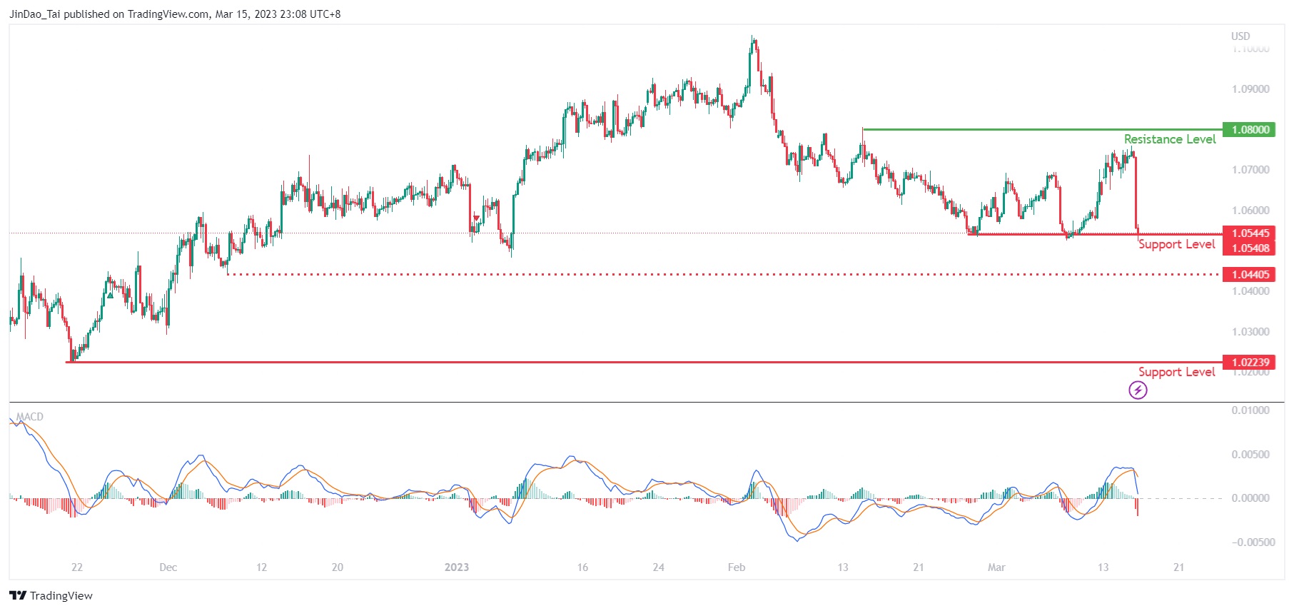 If the ECB releases a decision to hike rates by less than 50bps, this would be a major red flag to the market and also indicate a slowdown in its path of monetary policy tightening, which could see the EURUSD continue with the current downward momentum. If the price breaks below the current support level and the interim price level of 1.0440, the EURUSD could see significant moves downside, supported by the cross-over of the MACD, with the next key support level at 1.0220, which was the previous swing low in November 2022.