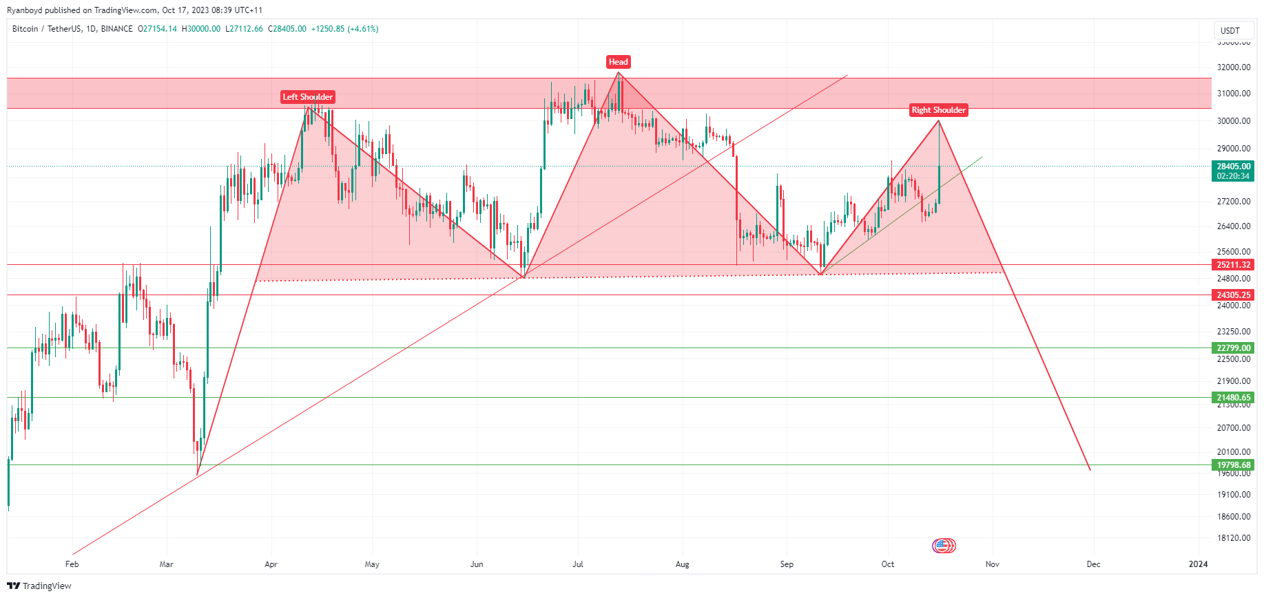 Currently sitting at the midpoint of a large range that has been holding firm since March. If the momentum continues, we could see price moving up towards the next major resistance level around 30k USD.