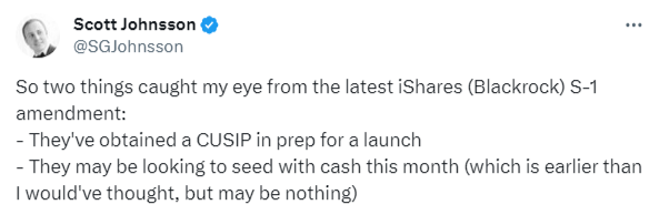 Finance lawyer Scott Johnsson shared these developments, highlighting that BlackRock has “secured a CUSIP in preparation for a launch” and suggesting that they might be considering seeding it with cash this month, an earlier timeline than anticipated.