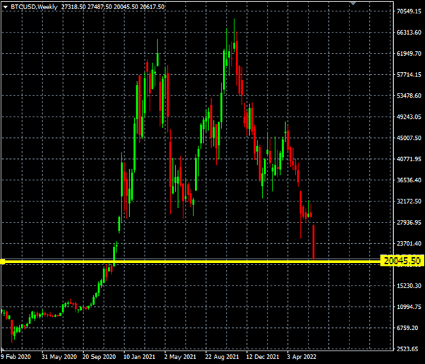 Bitcoin started the week at $27,000 USD which was a 10% decrease from Friday’s closing price of around $30,000 USD. Since the opening of the week, it has dropped another 23% to almost $20,000 USD. This is almost a 70% decline from last October’s peak of nearly $69,000 USD.