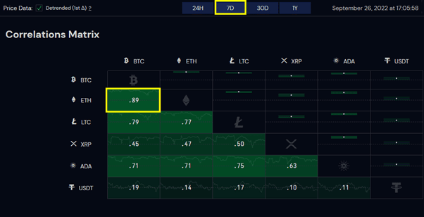 Looking at the correlation between Bitcoin and Ethereum, the last 7 days of price action shows a correlation of .89, which is a positive value that indicates a positive correlation between the two. A positive correlation means that the two moves very similar to one another.