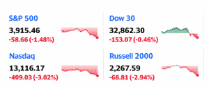 - NASDAQ down 409 (3.02%)