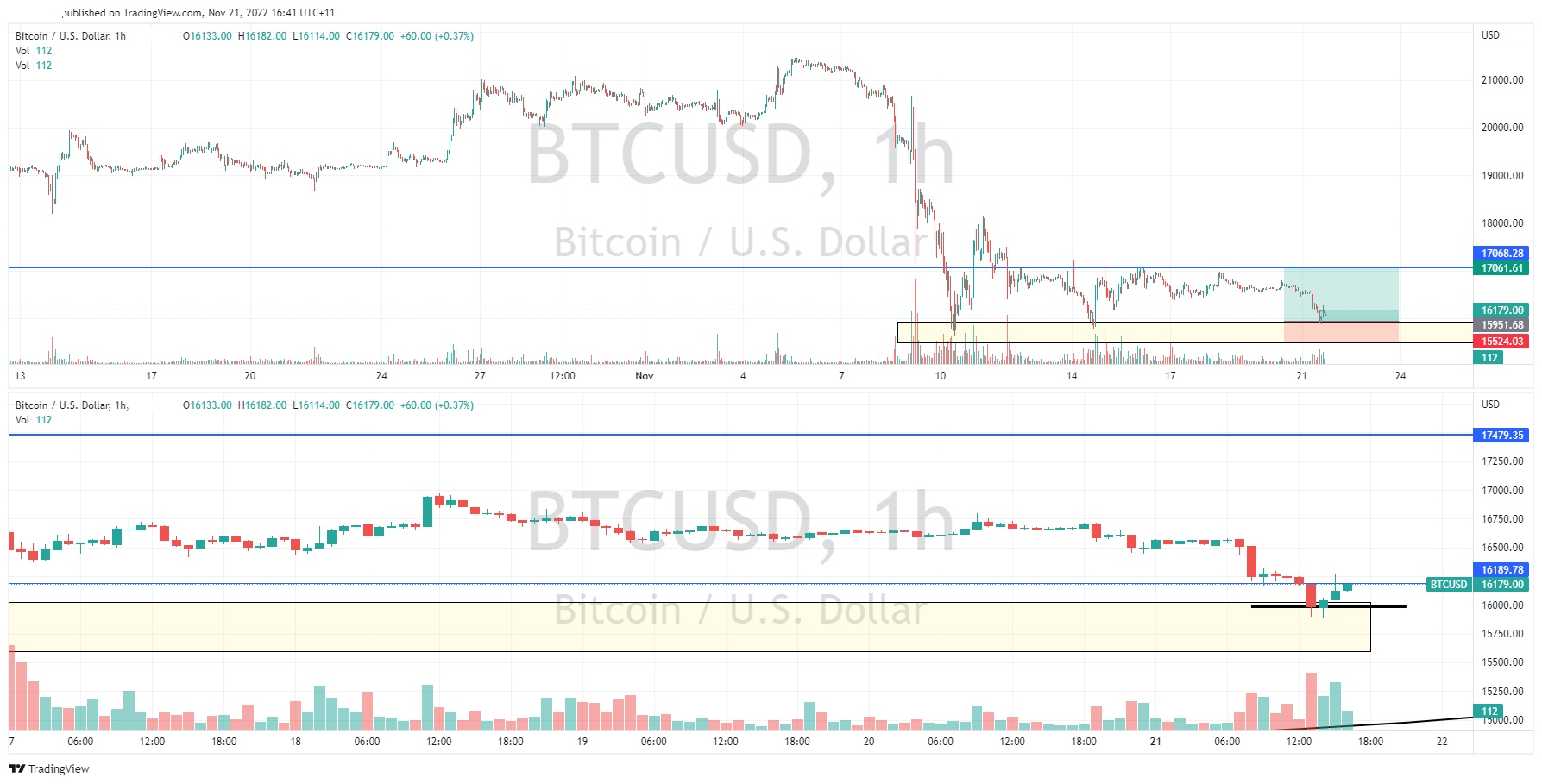 News & AnalysisBitcoin has recently tested the lows of its price range that it reached in the immediate aftermath of the FTX crisis. A long opportunity has been brought about after price bounced off these lows near $15,863. The hourly chart shows a potential good risk reward entry. The trigger for the entry is not just the fact that price has bounced off the support zone but is also the strong bullish candle stick at the support level.
