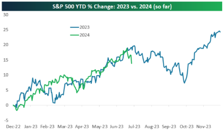But what’s really catching our attention is that the pullback in the second half of July looks very much like the pullback that started in July 2023. If we compare the SNP’s year to date performance in 2023 to what we have seen today in 2024 the correlation is surprisingly tight. Have a look at this chart.