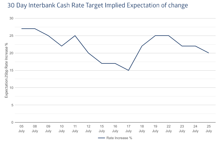 As this chart shows, the expectation of a rate rise on August 6 has been as high as 27 percent in fact at one point in the last two months it’s been as high as 46 per cent. This in our opinion has been fully factored out of FX trading in the Aussie over the last couple of weeks.