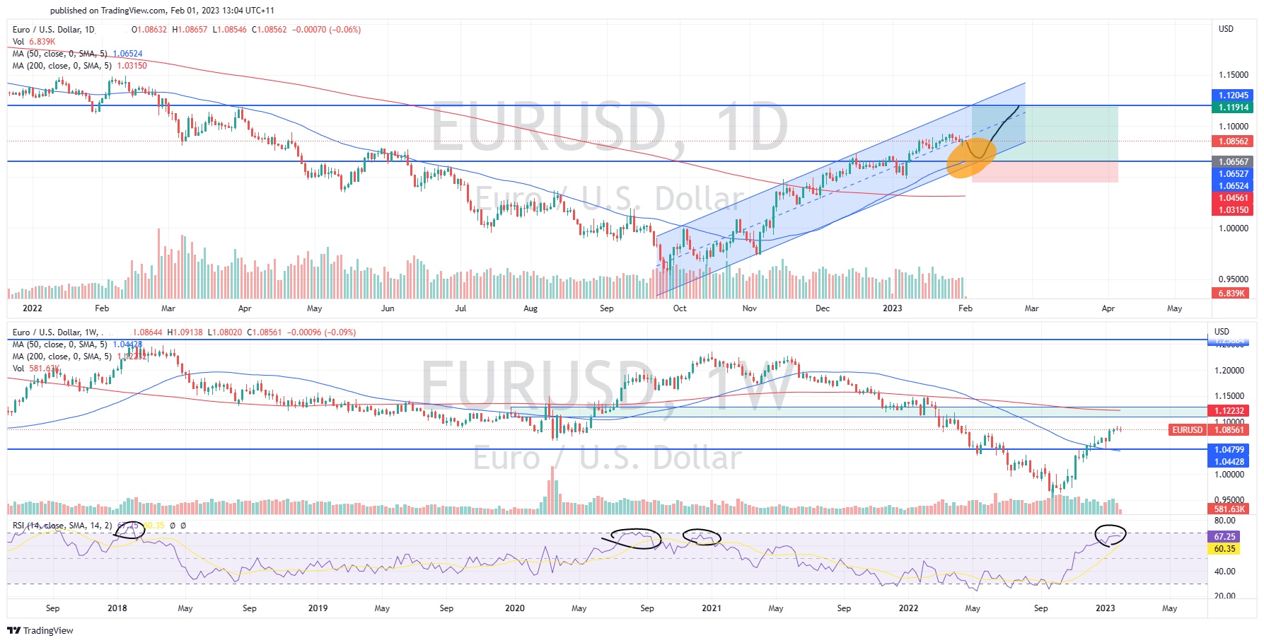 1 February 2023 By WixadThe EUR has been on a run since it bottomed in September 2022. From that time, the price is up almost 15% and is currently trading at 1.0863. However, with important economic data to come out of the USA and the next interest rate decision from both the ECB and the Federal Reserve coming out in the next few days the market may find some more direction for the EUR. A Hawkish Federal Reserve may be detrimental for a move to the upside of the EUR, whilst a Dovish response may support more growth in the EUR. In addition, with employment data to come out of the USA softer data may support a more dovish Federal reserve.
