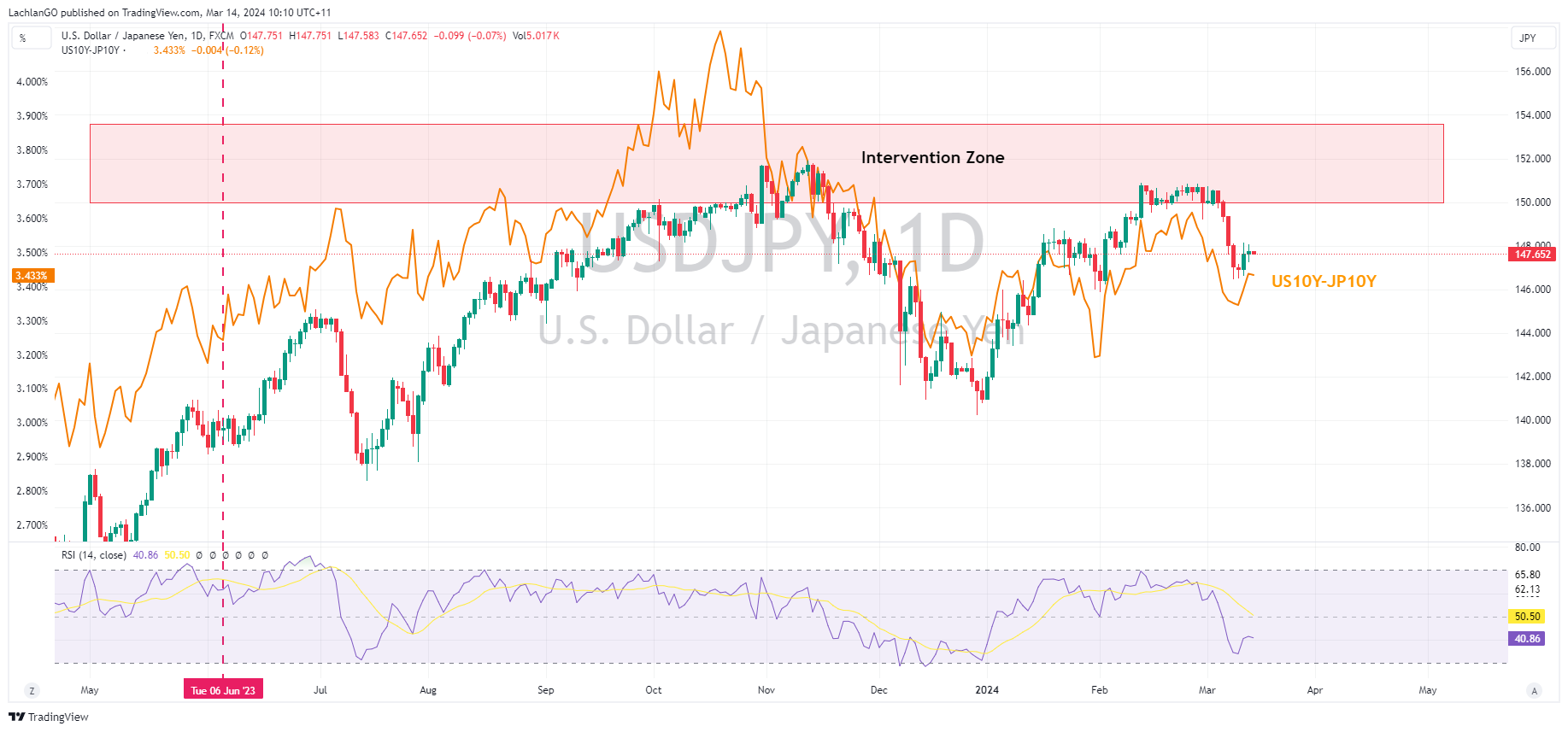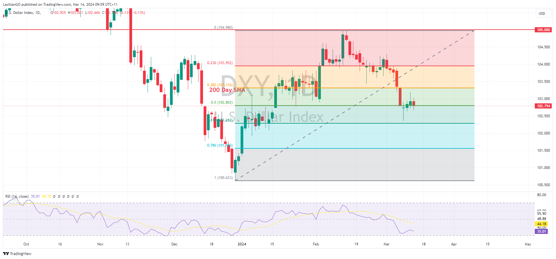 14 March 2024 By Lachlan MeakinUSD saw marginal weakness on Wednesday in a quiet news day. The US Dollar Index (DXY) pushing to lows after a strong 30yr Treasury saw yields drop and DXY briefly breaking beneath Tuesdays low of 102.72. A turn around later in the session saw DXY retake the 50% Fib support level at 102.80 ahead of today’s Retail Sales, Jobless Claims, and PPI data.