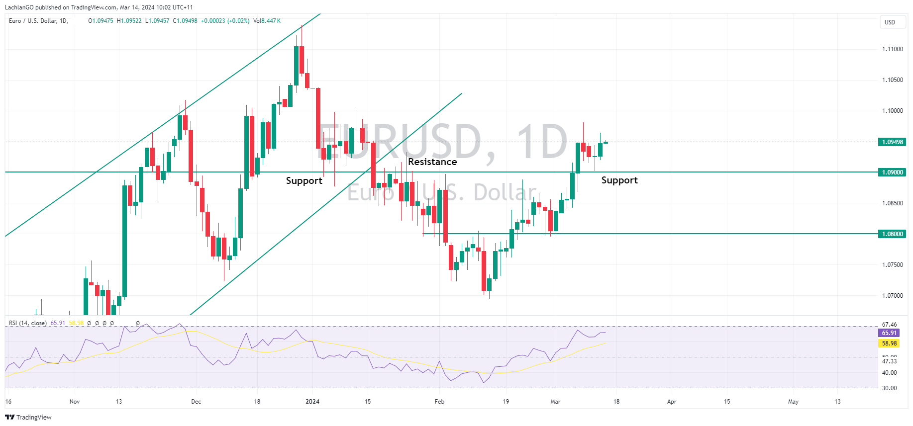 EUR saw decent gains vs the Dollar, with EURUSD setting a weekly high of 1.0948. ECB member Villeroy spoke, saying the ECB is winning the inflation battle, but cuts are more likely appropriate in June rather than April. EURUSD holding the key 1.09 support so far this week, with 1.10 the next major resistance level to the upside.