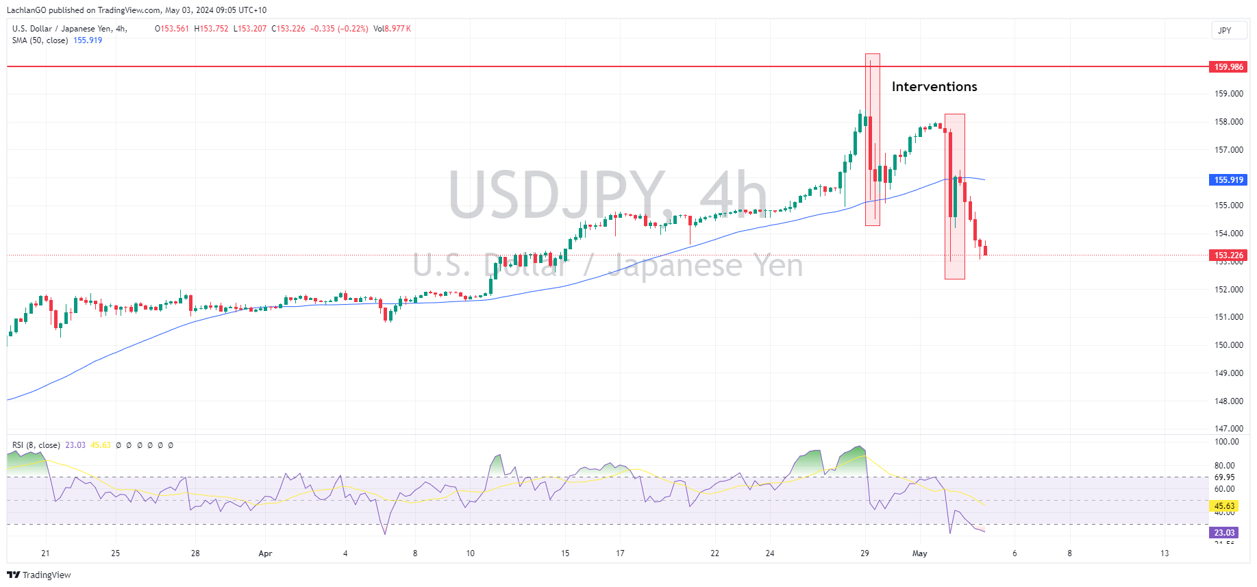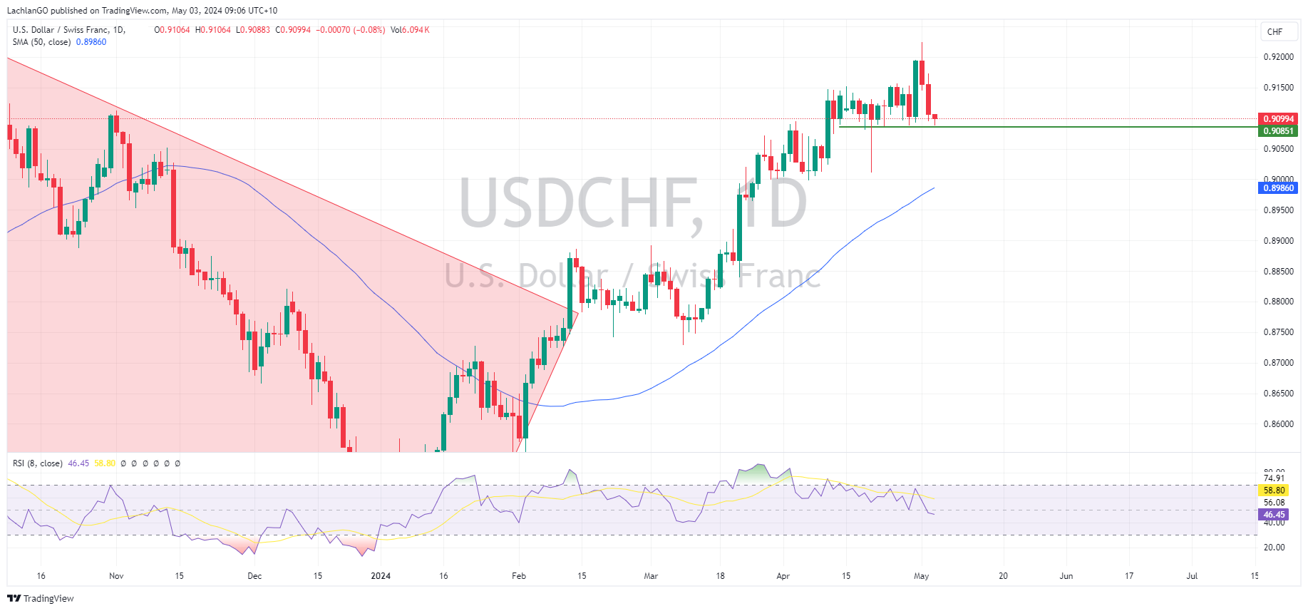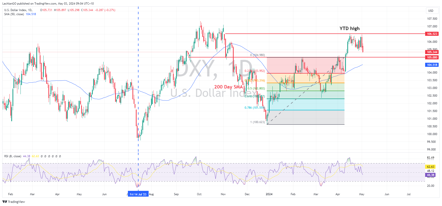 3 May 2024 By Lachlan MeakinUSD continued the move lower sparked by a somewhat dovish Powell in Wednesdays FOMC meeting. And ahead of today’s key NFP print. DXY did hit highs after hot labour costs data, though quickly reversed to hit 3-week lows of 105.29, closing at session lows and looking to test the major support at 105.