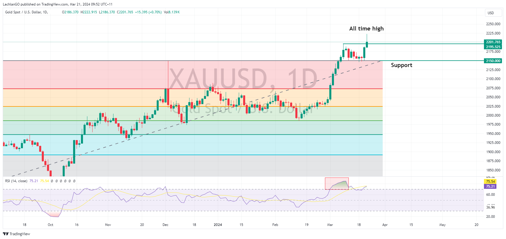 21 March 2024 By Lachlan MeakinUSD was notably lower after what was seen as a dovish FOMC meeting on Wednesday. The Fed 2024 median dot was left unchanged with 3 cuts for 2024 still the Fed forecast but the dovish part came at the presser where Fed Chair Powell downplayed the hot January and February CPI numbers. This dovish tilt saw risk assets surge and the USD dump.