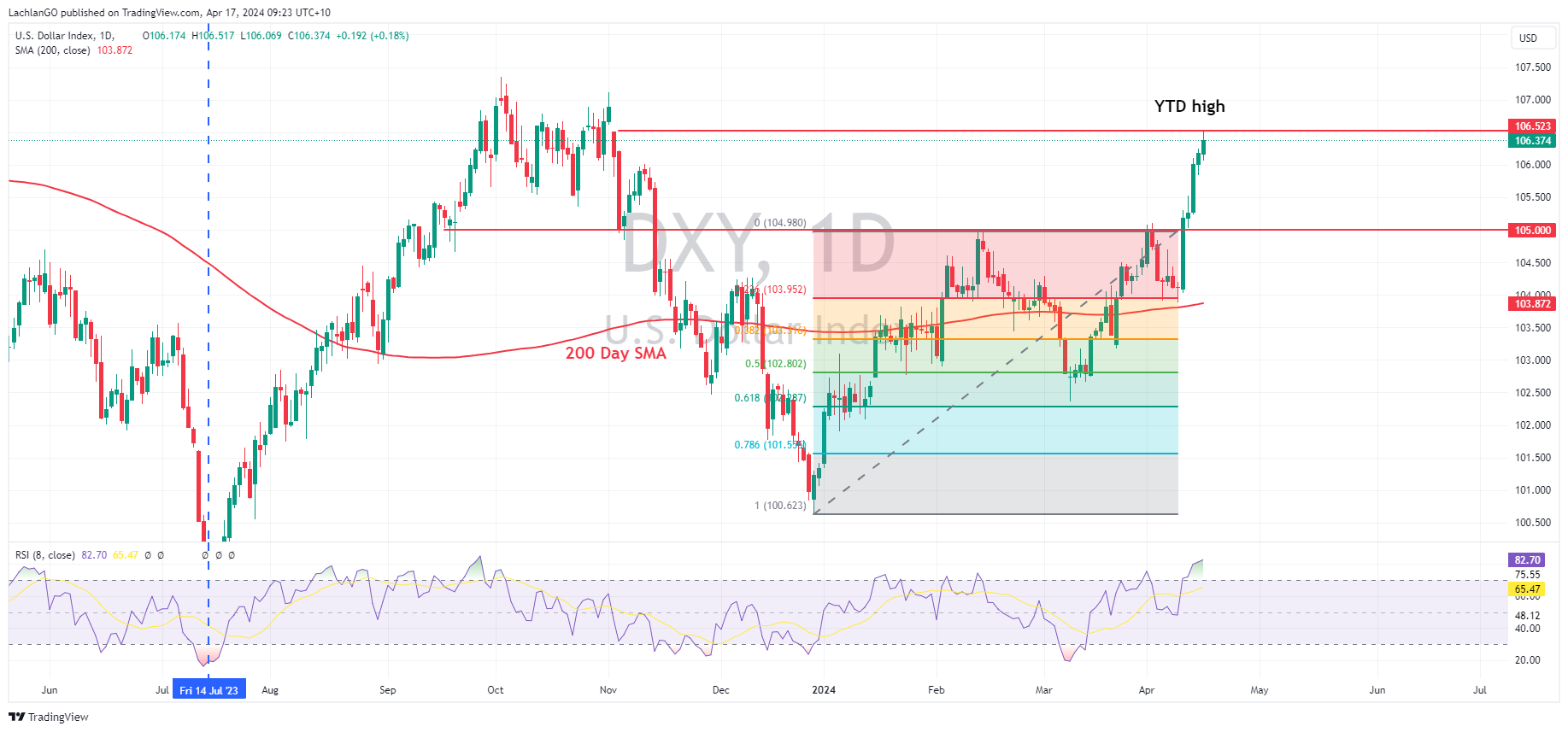 News & AnalysisNews & AnalysisUSD rallied in Tuesday’s session, with the US dollar Index hitting a 2024 high of 106.510 after hawkish Fed Chair Powell commentary where he noted recent data was showing a lack of further progress on inflation. Powell also added that if higher inflation persists the Fed can maintain current rate as long as needed. On data, building permits and housing starts came in beneath analyst expectations while industrial production was in line with forecasts but manufacturing output beat.