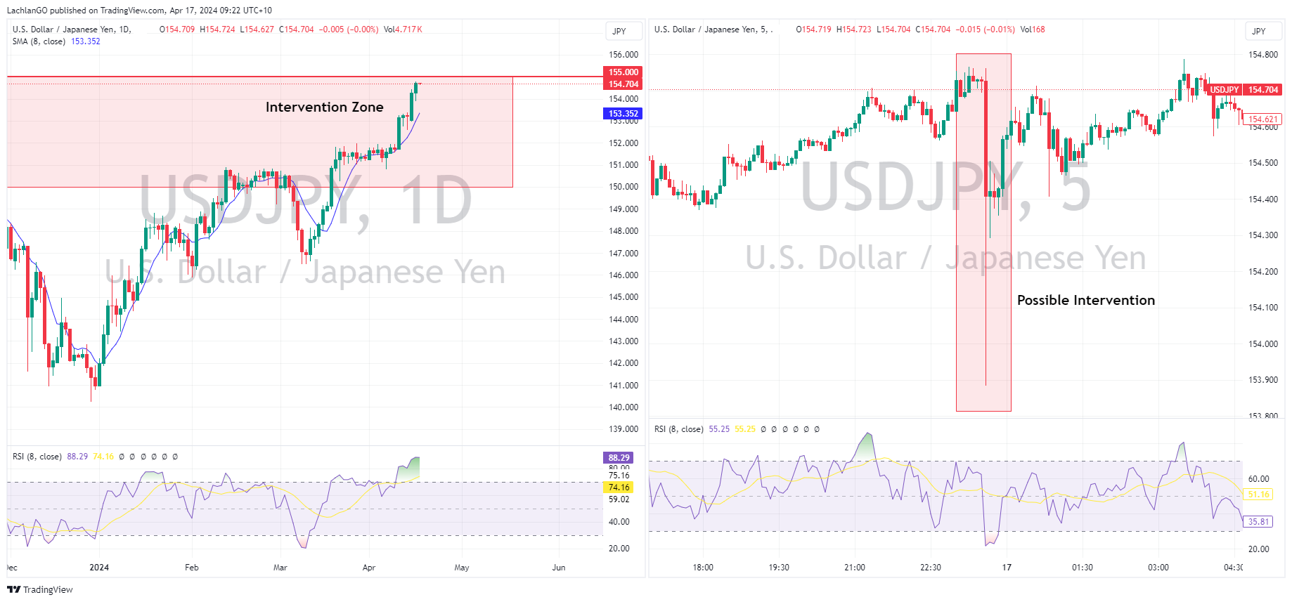 USDJPY moved higher for a 5th straight session, with the pair closing the New York session at highs of 154.78. There was what appeared to be an intervention earlier in the US session with a steep 100 pip drop on no headlines that quickly retraced. This looked like a shot across the bow from the BoJ with market participants suspecting intervention and will likely strengthen expectations that 155.00 is the line in the sand for Japanese officials.