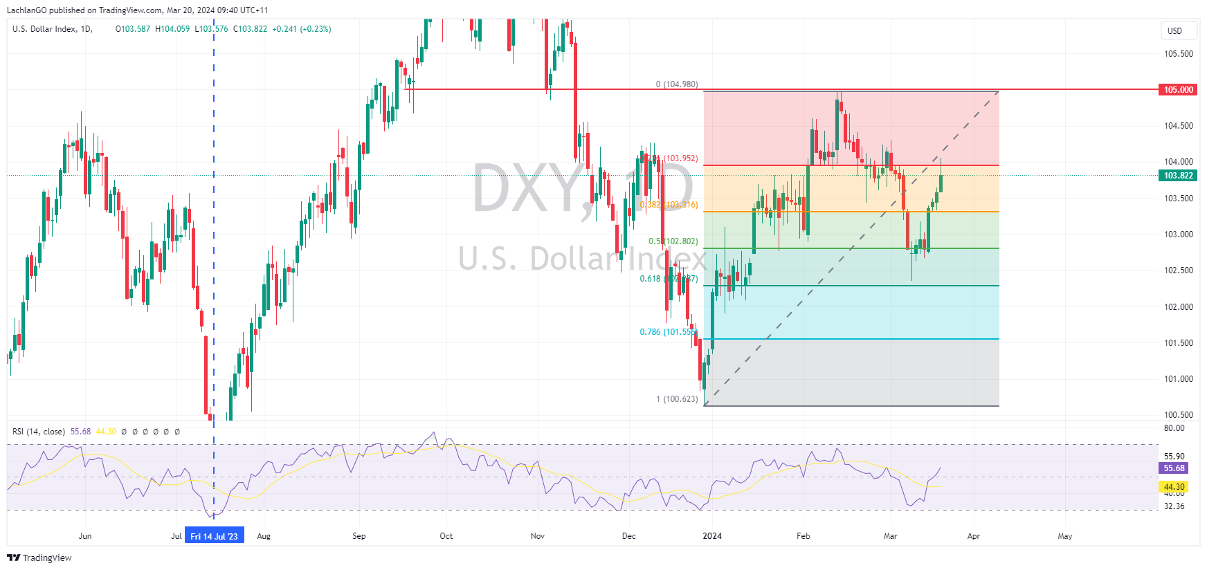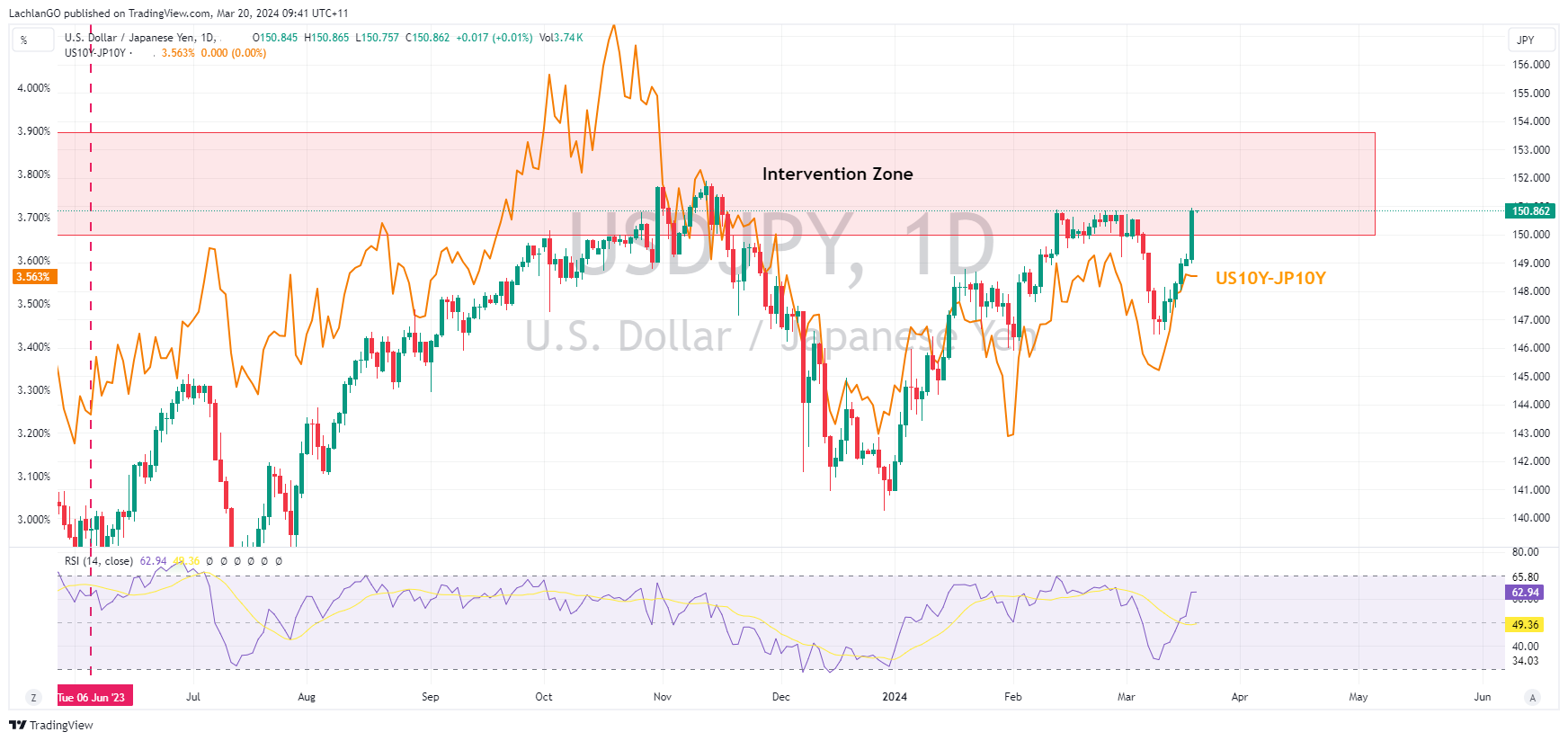 20 March 2024 By Lachlan MeakinJPY was the currency everyone was watching coming into the pivotal BoJ meeting on Tuesday. The BoJ, as widely telegraphed, ended 17 years of negative interest rates, ETF purchases and their yield curve control policy. While a big move from the central bank there was no real surprise, with USDJPY surging to touch on 151, well into the “intervention zone” above 150.