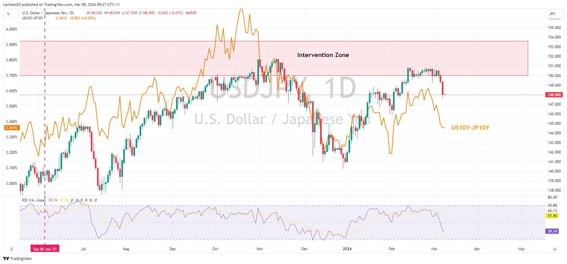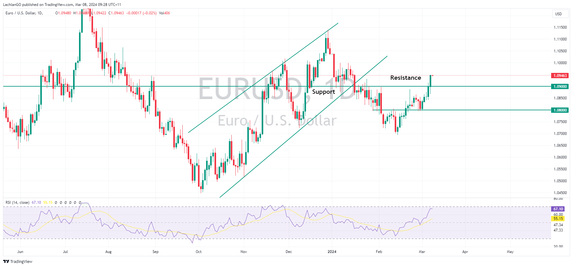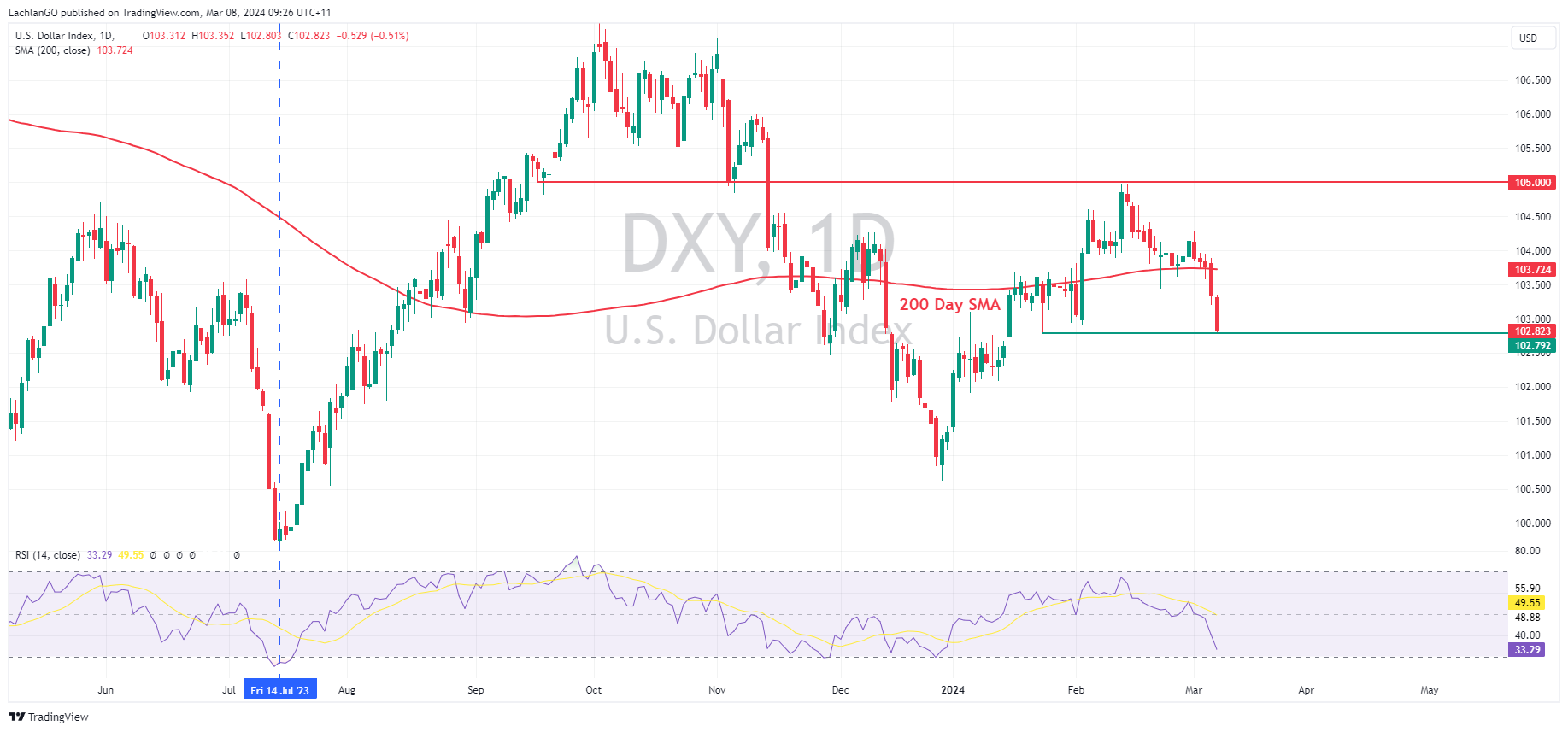 8 March 2024 By Lachlan MeakinUSD was notably weaker in Thursday’s session ahead of the pivotal NFP report on Friday. The US Dollar index falling for the fifth straight session and breaking below 103 to touch on the Jan 24 lows before finding some support. Risk-on sentiment, a fall in yields and weak jobless claims data being the main drivers of the Greenback decline.