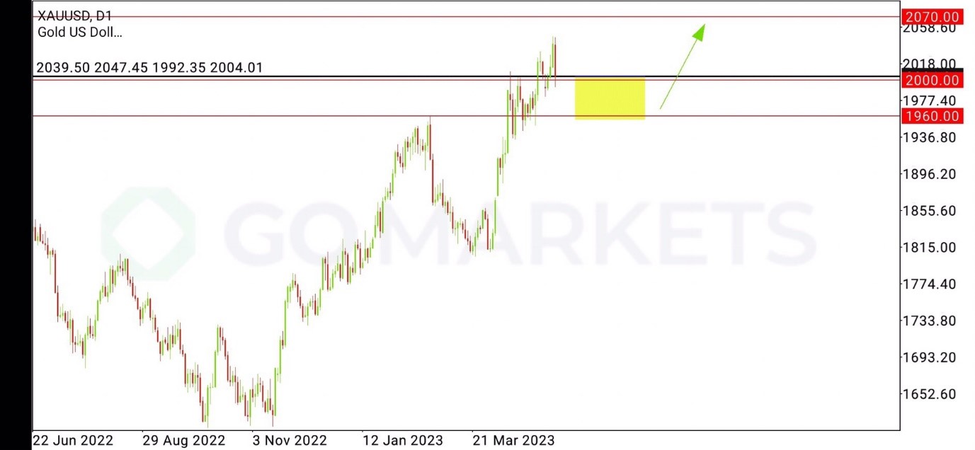 The gold price outlook is positive in the medium term. As last week’s closing of the buying bar was above the 1960 support or the latest high in price on the Weekly timeframe, it indicates the continued buying momentum that will allow the price of gold to continue. It can rise further to test the 2070 resistance level, which is a key resistance level at the weekly timeframe level and is the highest price level that gold has ever reached in history.