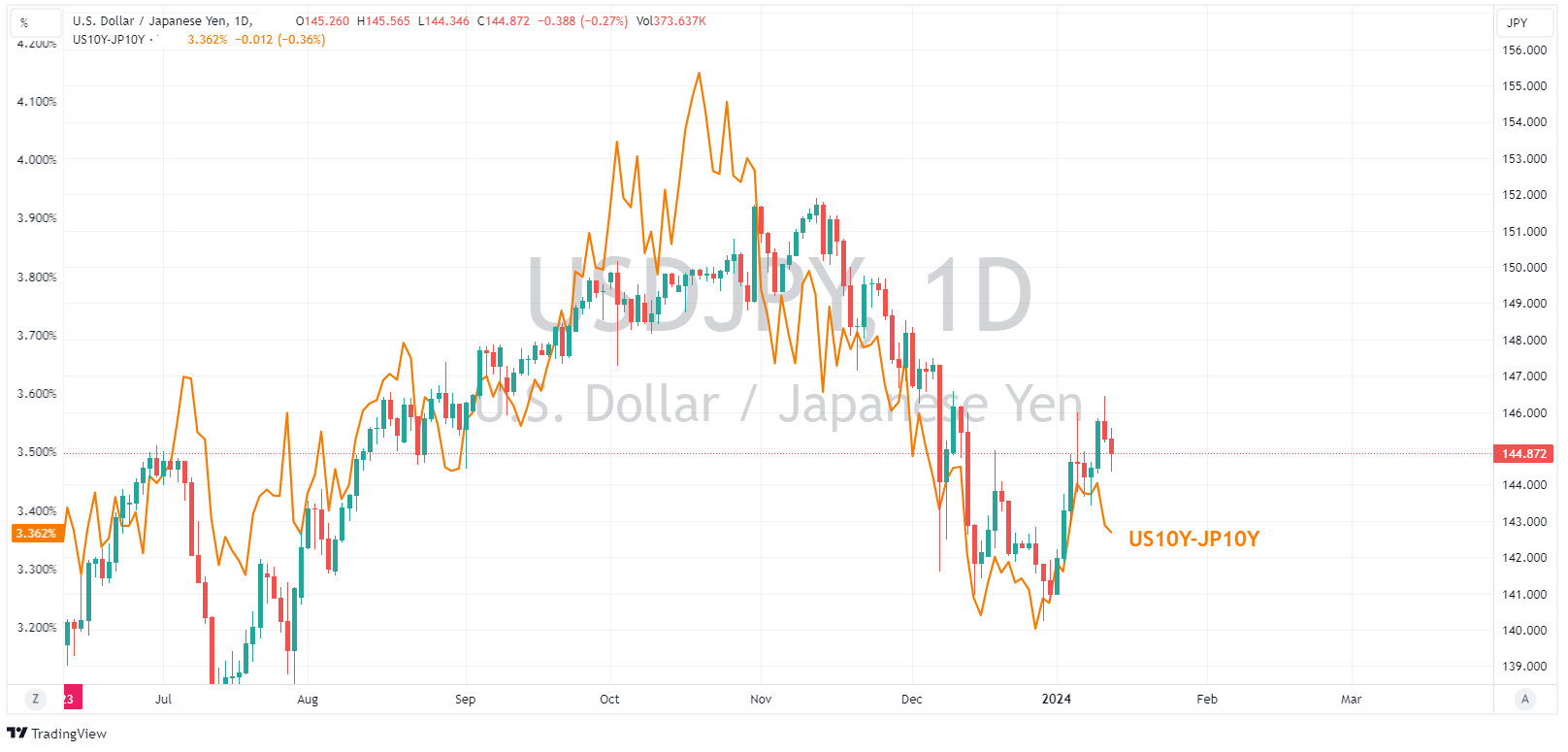 Bucking the trend of the low volatility of other pairs, USDJPY has had s harp rally so far in 2024, following US10-JP10 yield differentials higher. Last weeks move higher in the pair saw a disconnect in the relationship and USDJPY could struggle to push much higher unless this differential turns around. US economic releases this week will play a big part in where those yields go, with retail sales, employment and consumer sentiment all due to hit the wires from Wednesday onwards. 146 to the upside and 144 to the downside the key levels to watch for the chartists.