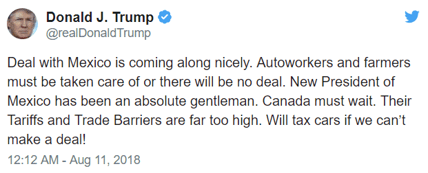 Even though the talks between the US and Mexico are going well, there will be no final deal on NAFTA unless Canada agrees to re-join the renegotiations. In a recent tweet, Donald Trump praised the new President of Mexico, however, he had a dig at Canada’s tariffs and trade barriers, threatening to tax Canadian made cars if they cannot make a deal.