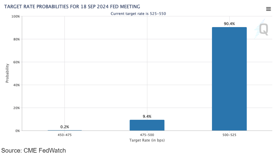 That is now all changed downside surprises to the second quarter inflation and the continued rise in the unemployment rate have not only met cuts are likely but for the first time in 10 weeks the market is now forecasting 100% likelihood of a September rate cut.