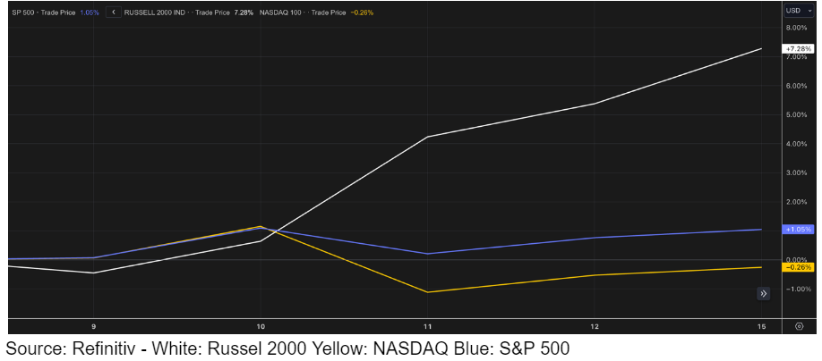 Source: Refinitiv – White: Russel 2000 Yellow: NASDAQ Blue: S&P 500