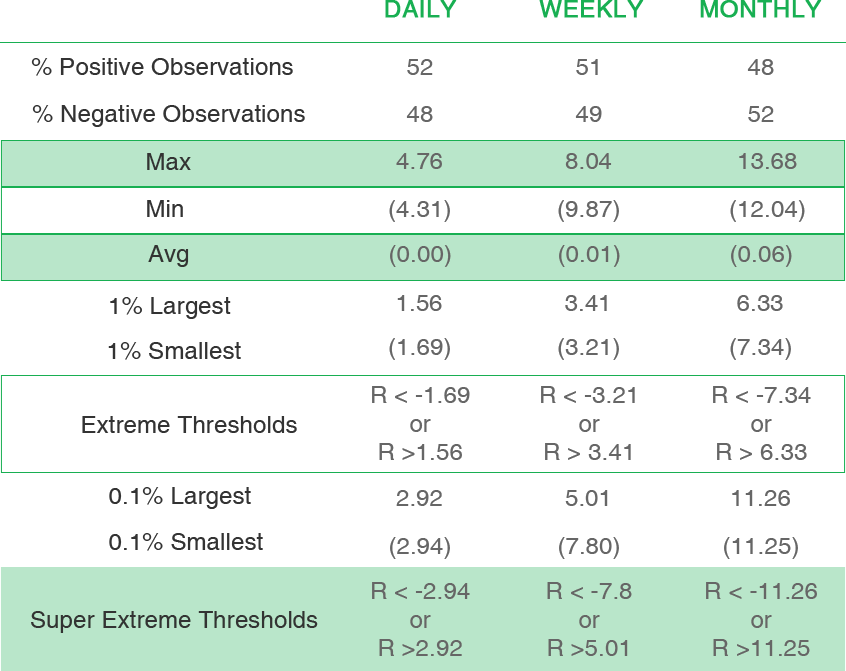 For example, looking at the monthly range, if any one month’s return is between -7.34% to 6.33%, you can call that month a normal month. However, if it moves outside of those limits, then that is going to be an extreme month.