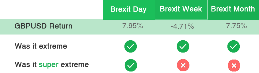 As you can see from the table above, Brexit was an extreme move in all time frames. However, with the exception of daily prices it cannot be accounted as a super extreme move.