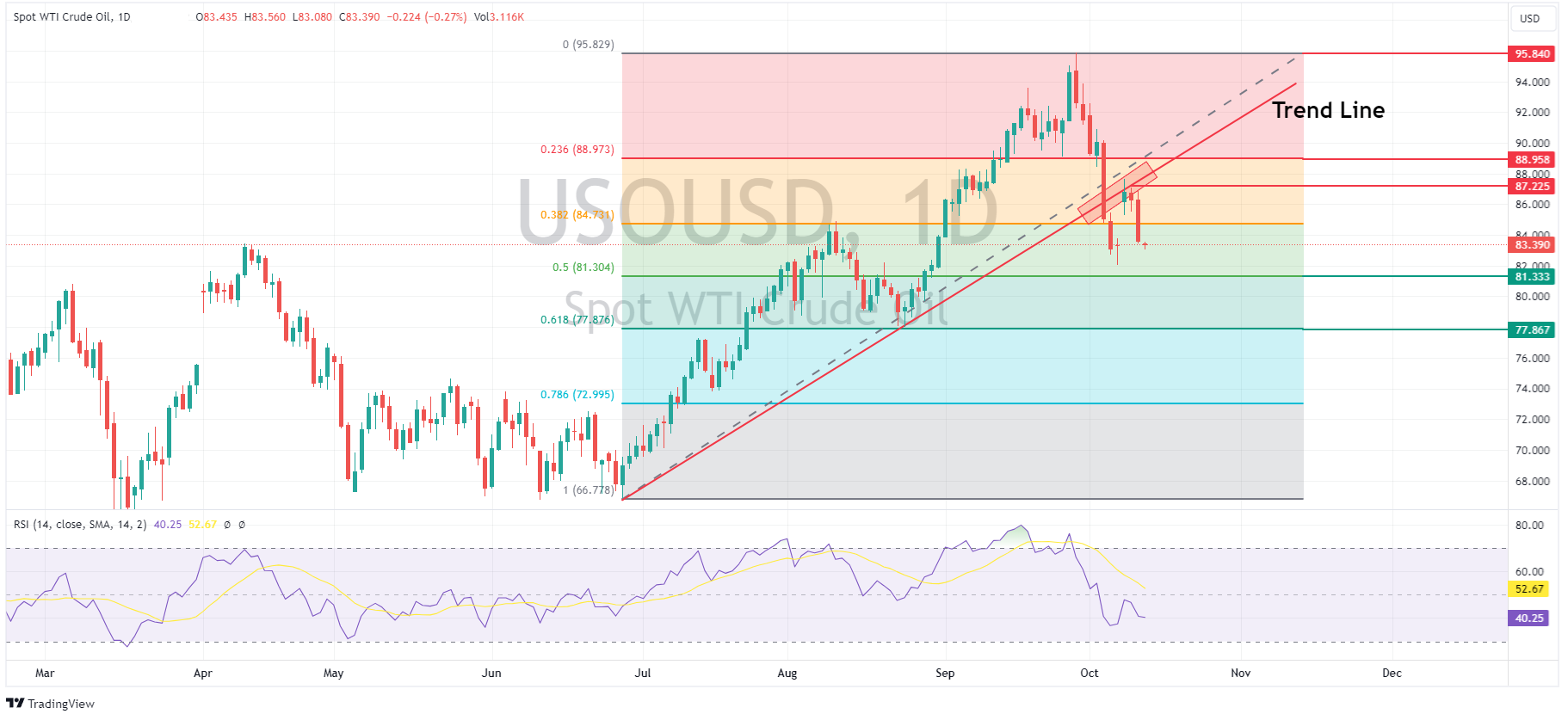 12 October 2023 By Lachlan MeakinWTI Crude oil got off to a flyer on Monday open as news broke of conflict in the Middle East saw a hefty risk premium being priced in fueled by fears of supply disruptions. It seems some of those fears have abated and along with a massive crude inventory build of almost 13mm barrels reported by API on Wednesday, a classic gap fill chart pattern has formed on USOUSD after a steep drop, with USOUSD currently trading at 83.37, down markedly from the conflict spike high of 87.65 in Monday’s session.
