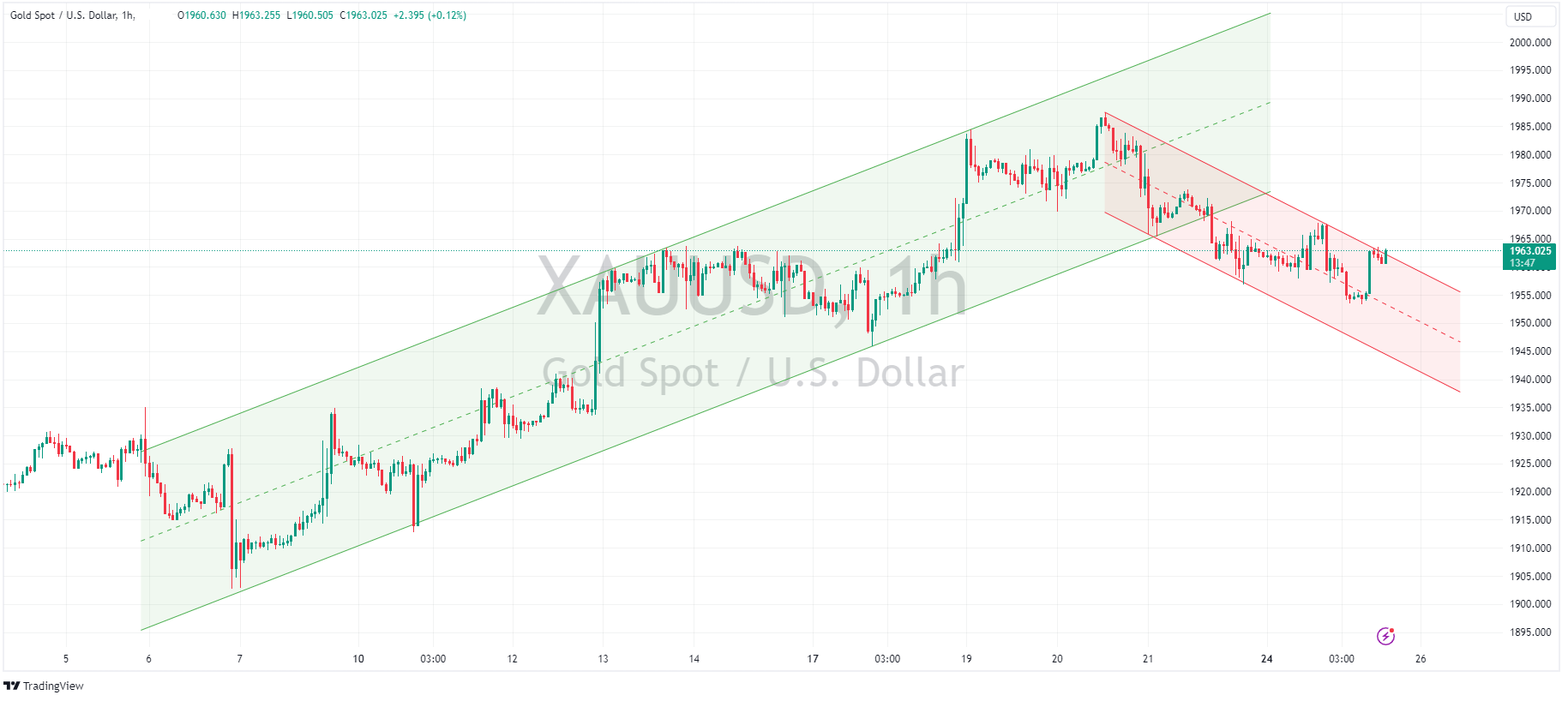 News & AnalysisAfter a fortnight of trending north, Gold has fallen over the past 5 days. It is currently trading at around $1960, showing a slight decline of approximately 1.35% from its recent high of $1987.53.