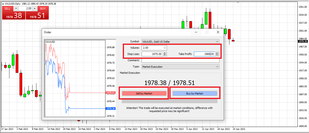 As with any instrument, make sure you are familiar with the lot sizing. 1 standard lot in gold (XAUUSD) is 100 ounces, or $100 USD a point so make sure you set the volume to a level commensurate to your account size and risk appetite.
