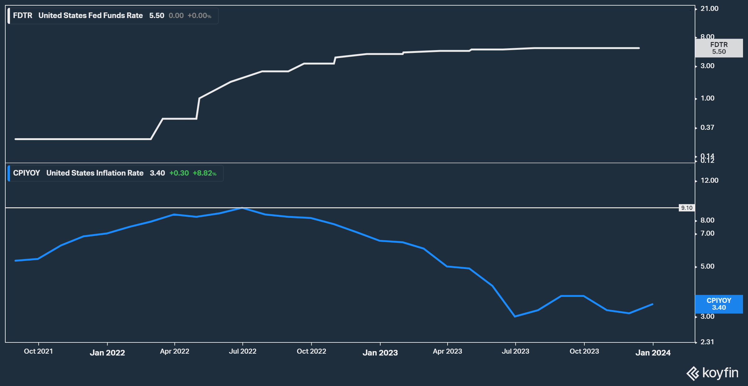 The current economic landscape in the United States, along with projections for rate cuts in 2024, also is playing a pivotal role in Gold’s recent performance. In response to US inflation climbing from nearly 0% to a peak of 9.10% in July 2022, the US Federal Reserve has raised interest rates 11 times. The rates have surged from 0.25% to the current 5.50%.