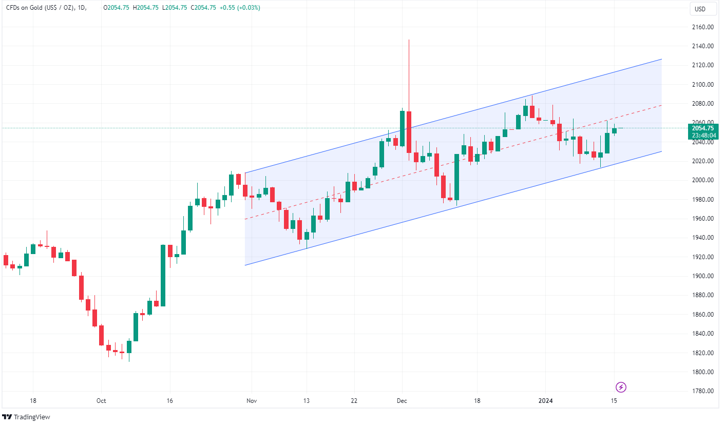 16 January 2024 By Ryan BoydSince reaching a local bottom in October of last year, XAUUSD has experienced a strong uptrend of over 13%. Closing its third consecutive positive session, Gold is inching closer to its all-time high, now sitting just above $2,050 USD per ounce.