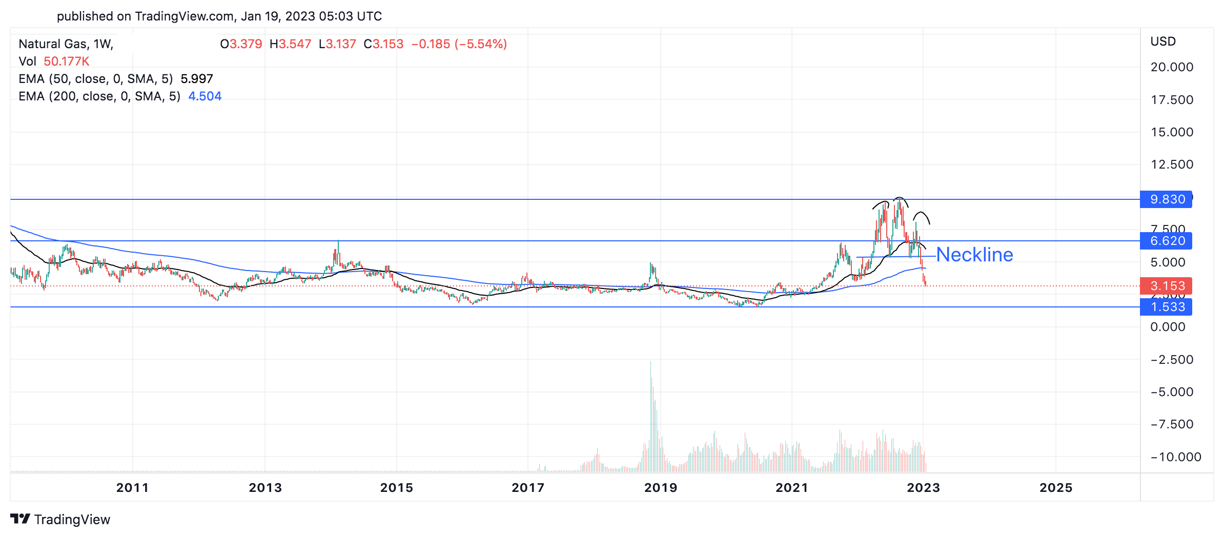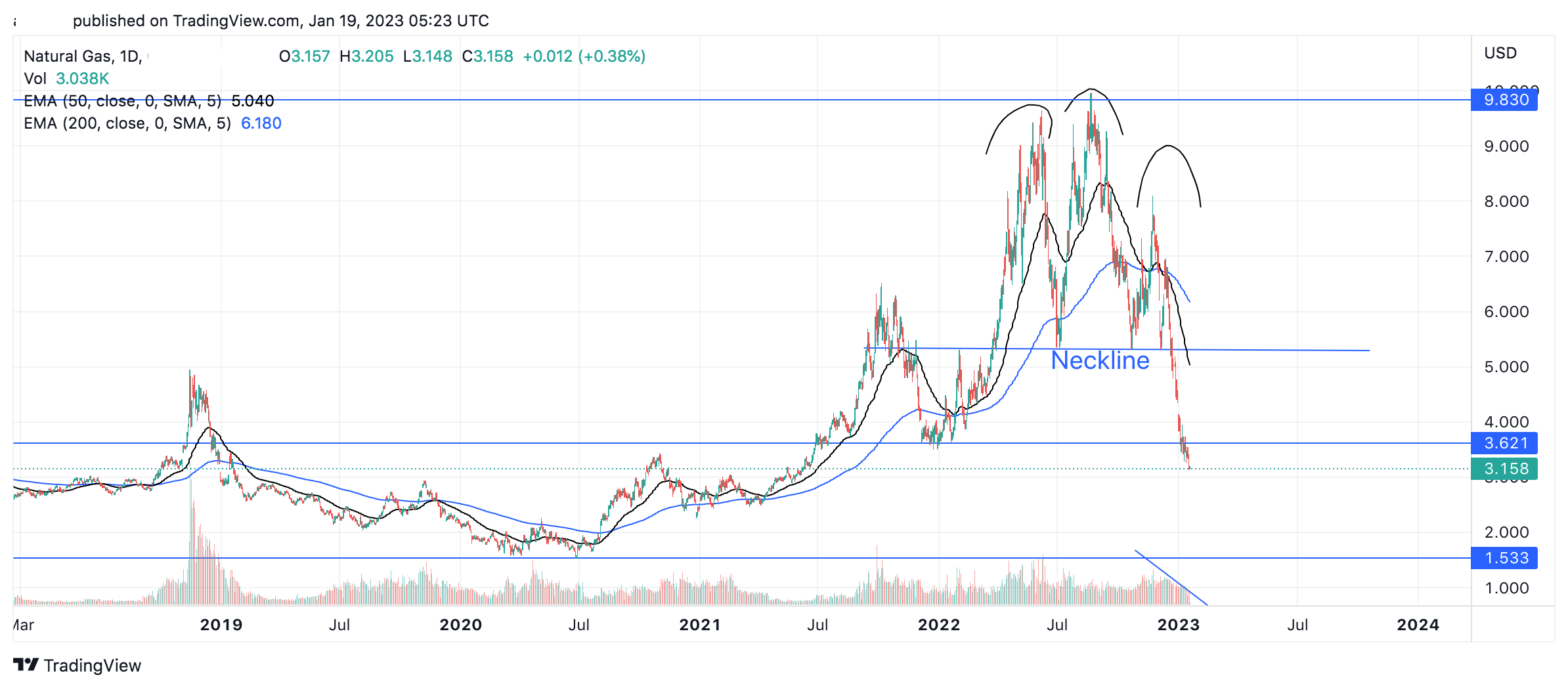 The chart from a technical perspective is exceptionally bearish. For the better part of a decade the price was ranging between 1.5 – 6.5. The aggressive move in 2022 as discussed was due to the beginning of the Russia and Ukraine crisis. The price since then looks to have made a head and shoulders pattern which is a bearish reversal pattern. The neckline was at 5.5 and was broken through. The price has also broken down through the 200-day EMA on fairly aggressive volume.