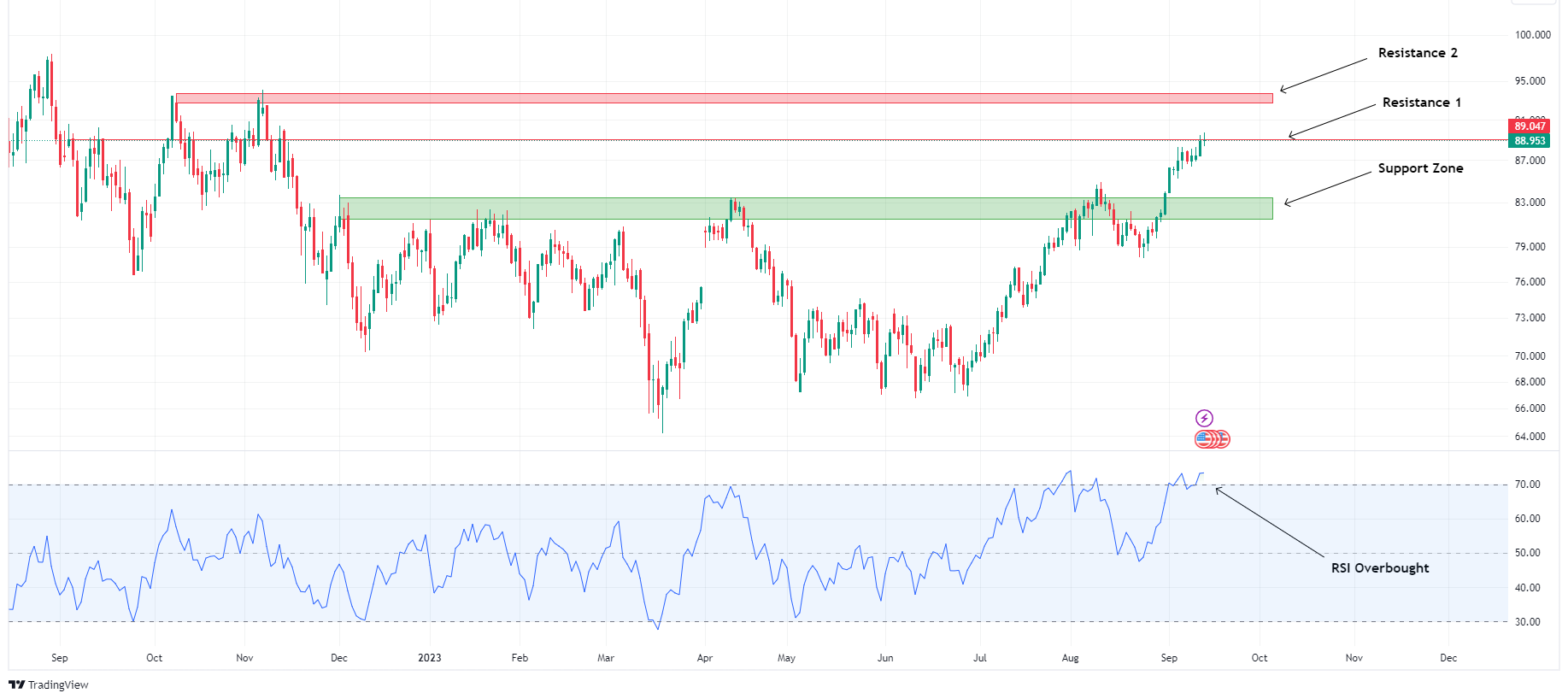 Should the momentum continue, the path to a critical resistance level at around $93 becomes relatively clear. This level proved resilient in two prior attempts to breach it back in October and November 2022, making it a level to keep an eye on for traders.