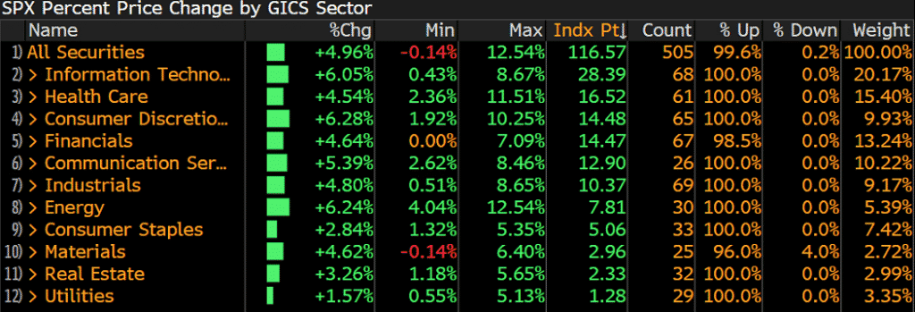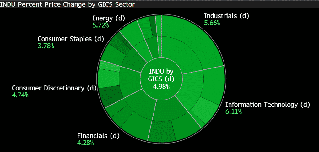 - The S&P 500 also rose by 5%, and 11 sectors within the benchmark were trading in positive territory. The technology, consumer discretionary and energy sectors were leading the gains while the material sector was on the back foot dragged by metals and mining stocks.