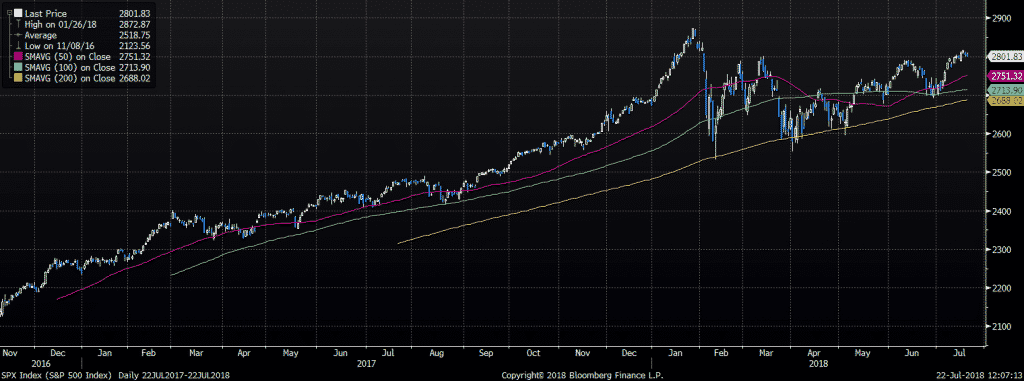 With relatively sound fundamentals driven by strong earnings growth so far in this earning season, US equity markets have continued their bullish trend. The S&P500 bounced back strong from its 100-day moving average in early July, and by going over the 2800 level, it seems to be on track to reach its all-time high of 2870, possibly even winning new grounds.