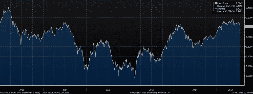 On a macroeconomic level, we note that the difference between short term and long term interest rates is narrowing down rapidly. This phenomenon, also known as yield-flattening, is usually seen as a signal that long-term growth is potentially not as strong as short-term growth. When yield-flattening turns into yield-inversion (where short-term rates are higher than long-term rates) and is combined with increasing cost of borrowing for companies, higher inflation, and rising unemployment, it can be a serious sign of an upcoming recession. Inflation expectations have somewhat stalled over the past few months, but as shown in the chart below they are on a clear strong upward trend.