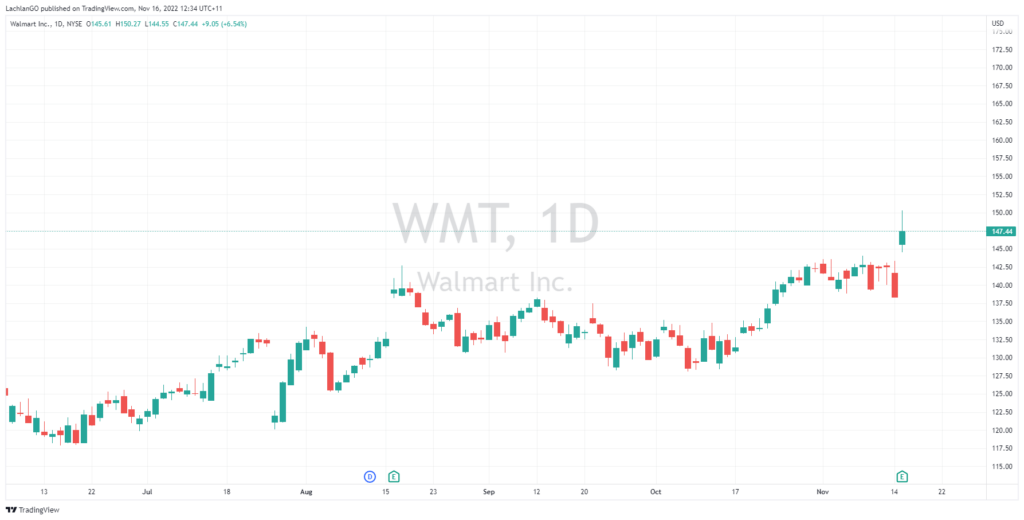 Shares of Walmart were up by 6.54% on Tuesday at $147.14 a share.