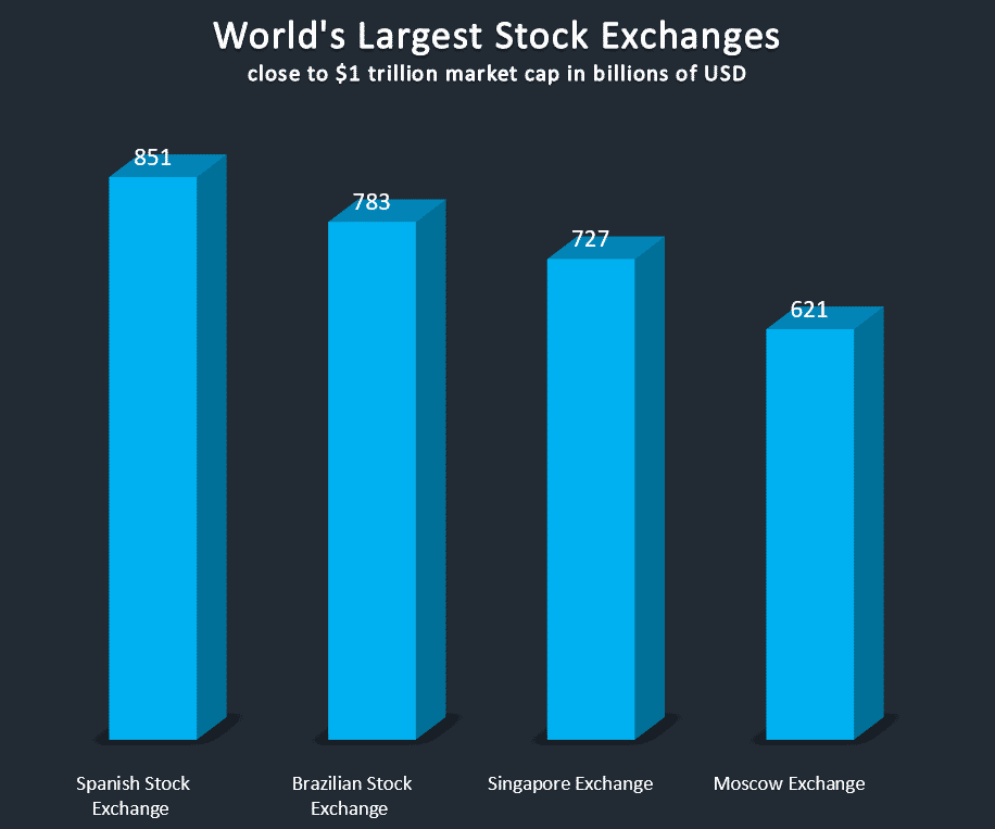 The closest stock exchange to join the ”$1 trillion club” is the Spanish Stock Exchange (BME) at $851 billion market cap. Some of the biggest companies listed include Spain’s two largest banks – Banco Santander and BBVA and global energy company Repsol. Brazilian Stock Exchange in Sao Paolo is second closest the $1 trillion market cap at $783 billion. If it does reach the $1 trillion market cap, it will become the first South American stock exchange to reach the milestone. Other two exchanges closest to the milestone include the Singapore (SGX) and Moscow (MOEX) stock exchanges at $727 and $621 billion market cap respectively.