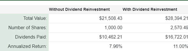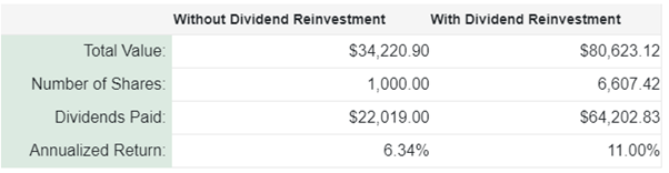 This highlights how important having as much time in the market as possible can make a huge difference to the overall returns of a reinvestment strategy/portfolio. The return for 10 years with reinvestment is around 1.32 times the amount for without reinvestment. Having the same investment for an extra 10 years will yield a return a result 2.35 times better than if the dividends are aid in cash.