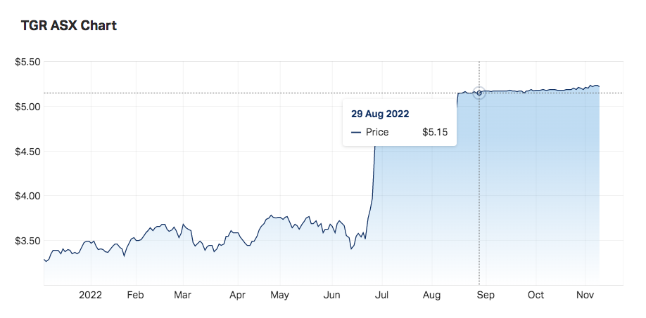 In a recent example, company Tassal formally TGR.AX, announced it was being bought out by a private equity firm. There were previous offers made at $4.67, $4.80 and $4.85 per share before the final offer came at $5.25 a share. It can be seen from the price chart that the share price did not reach $5.25 immediately. The interesting thing to note here is that even though the final and accepted offer came in at $5.25 on the day of the announcement the price only reached $5.12 still $0.13 short of the offer. This represented an arbitrage opportunity of $0.13 for savvy traders and investors. Although the actual % gain was not very high, the relative certainty of the price target made this trade a potential big winner. Opportunities like this are not always perfect and deals may not always follow through, but a skilled trader can develop a very strong system around this premise.