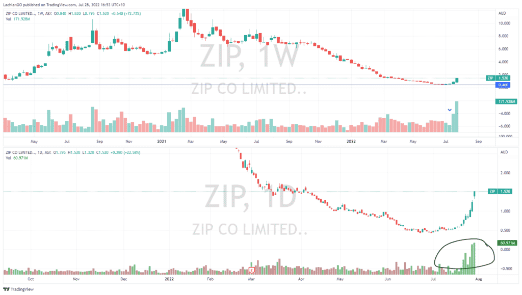 In this instance, ZIP on the weekly chart saw a massive jump in volume, followed by an even larger jump in volume the following week. Importantly ZIP, according to (Shortman.com.au) had a short % of 7.34 on July 1 2022, prior to the breakout. Looking at the daily chart underneath, the sheer volume of buying continued to get larger and larger which is indictive of a short squeeze as large positions began to close. The subsequent price action provided great consistent buying opportunities for traders.
